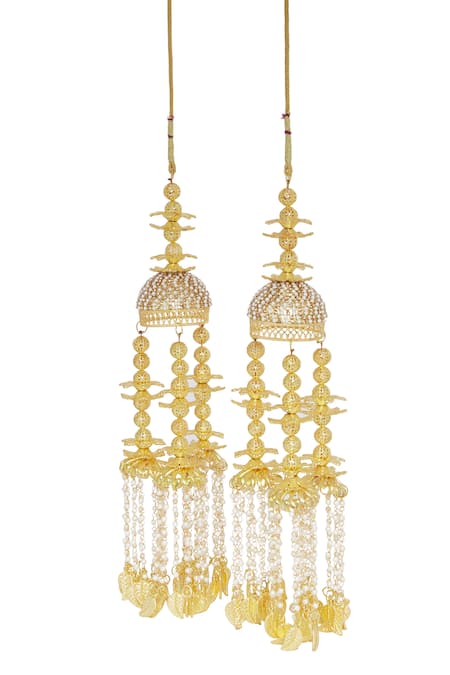 Gold plated tying kaleeras featuring leaf charm embellishments and pearl tassel drops. Set includes two kaleeras designed for traditional occasions.