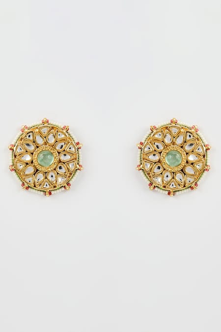 Gold plated geometric shaped stud earrings with emerald green kundan, polki embellishments.