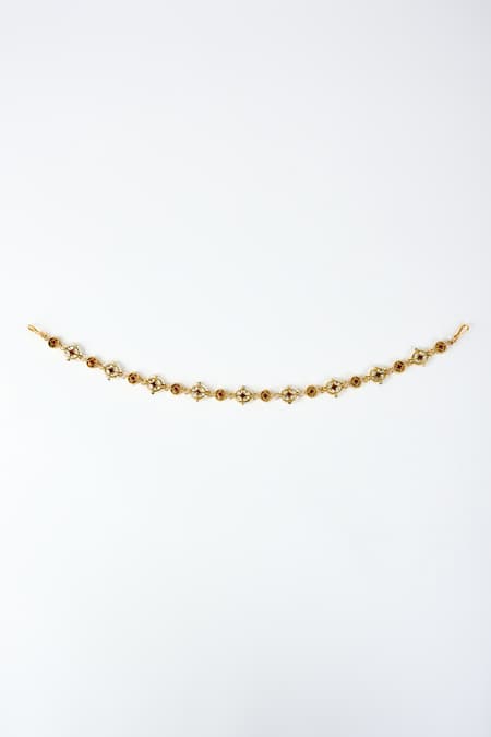 Gold plated mathapatti with red, white gemstone, kundan, polki & pearl embellishments.