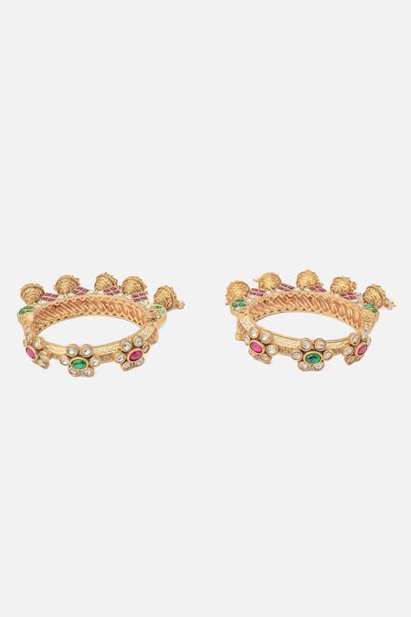 Gold plated set of 2 bangles featuring intricate vine motifs. Adorned with kundan polki and red & green stone embellishments.