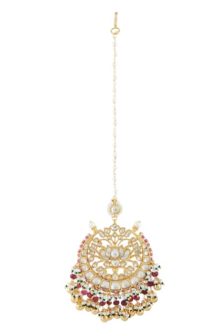 Gold maangtikka featuring crescent moon motifs adorned with kundan, pearls, and bead drops
