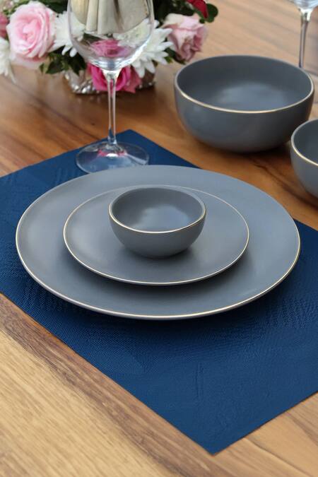 Pebble grey dinner set with gold rim detailing on border, including 6 dinner plate, 6 quarter plate, 6 veg katori bowl, 1 oval plate, 1 big curry bowl, 1 medium curry bowl.