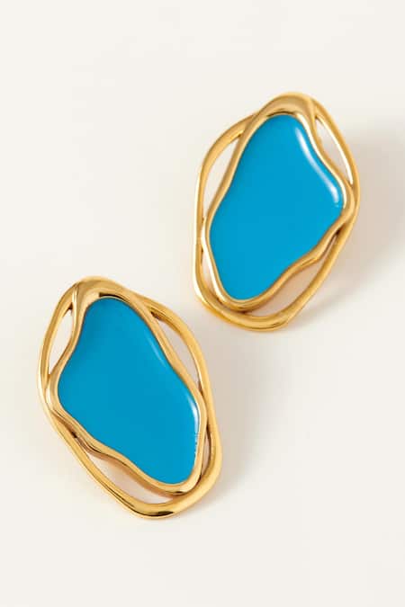 Blue stud earrings featuring an abstract shape with a cutwork border