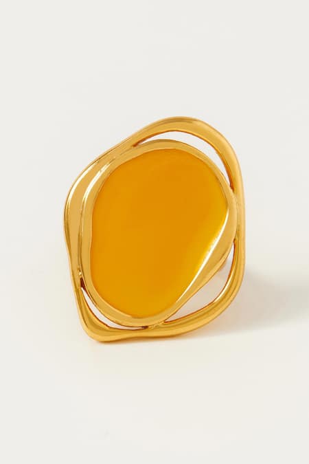 Abstract shaped ring featuring yellow enameled details and cut work border