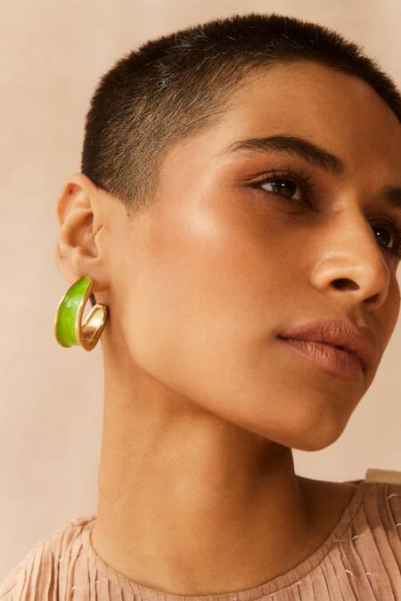 18k gold plating with lime green enameling, Abstract semi-hoop design, Push back clasp for secure fit