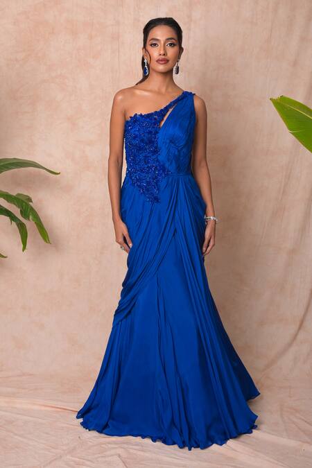 An Ink Blue gown crafted from flat chiffon and net fabric, featuring a one-shoulder design with intricate hand embroidery on the bodice.