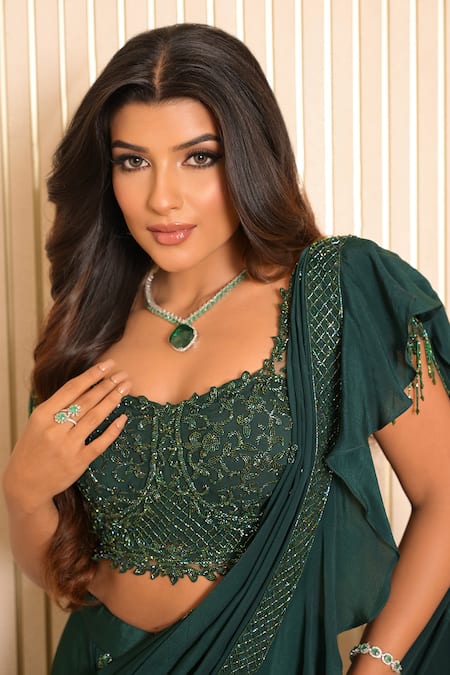 Green pre-draped lehenga saree featuring hand embroidered ruffled pallu. Paired with a padded blouse adorned with hand embroidered cutdana and tassels at the sleeves.