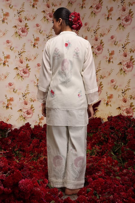 Ivory Chanderi Silk Embroidery Round Neck, Collared Jacket Pant Set