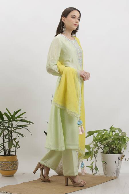 Buy_Vrinda By Pundrik Dubey_Green Kurta Cotton  Dupatta Chanderi Embroidered Straight Set_at_Aza_Fashions