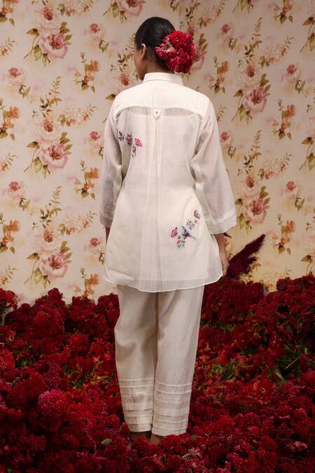 Ivory chanderi floral embroidered flared top featuring a shirt collar and long sleeves. Paired with matching pants with button closure.