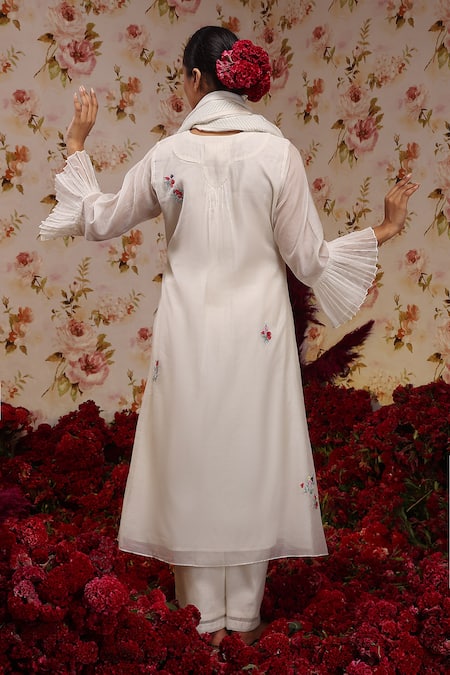 Ivory chanderi silk kurta featuring floral embroidery and pleated sleeves. Paired with matching pants and a tasseled scarf.