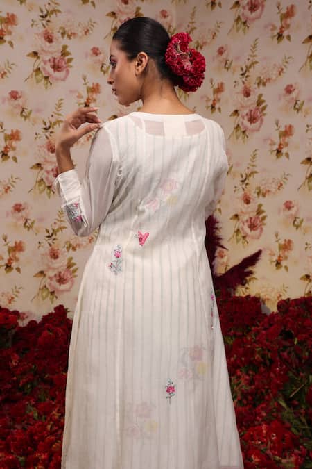 Ivory chanderi silk kurta featuring floral embroidery and pintucked yoke. Paired with a matching pant and dupatta.