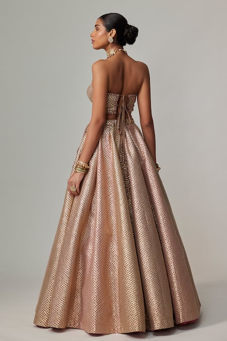 Multicolor lehenga featuring deep beige, mud mauve, and dark blush tones with golden gota embroidery. Paired with a structured corset in georgette fabric.