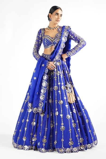 Royal blue lehenga, fully embroidered with hand cut real mirrors in big floral buttas & linear pattern. Comes with embroidered blouse & dupatta.