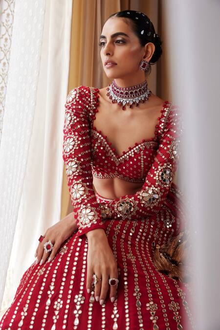Crimson red lehenga, fully embroidered with zari, hand cut real mirrors in small floral buttis & linear pattern. Comes with embroidered blouse & dupatta.