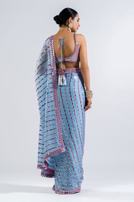 Ice blue pre-draped saree featuring linear pattern mirror work and a metallic sequin blouse. The blouse has a back hook-eye closure with a tie-up detail.