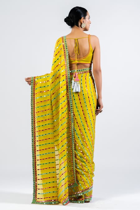 Buy_Vvani By Vani Vats_Green Satin Mirrors Round Neck Embellished Pre-draped Saree With Blouse _Online_at_Aza_Fashions