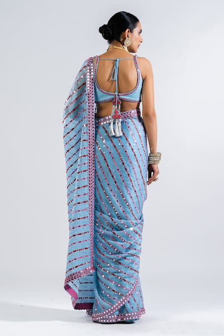 Ice blue pre-draped saree featuring real hand cut mirror embellishments. Accompanied by a plain satin blouse with a back hook-eye closure and tie-up detail.