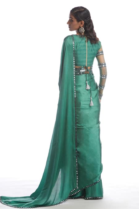 Sage green saree with cutwork border paired with mirror embellished belt. Comes with net sheer sleeve blouse.