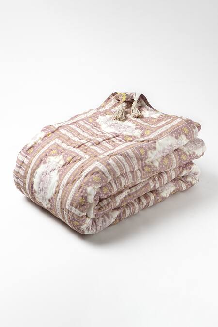 Pink and yellow handcrafted sapphire silk cotton reversible jaipur quilt with 100% cotton filling, hand stitched and ornated with tassels on 4 corners.
