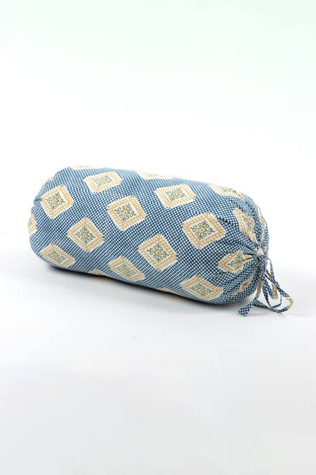 Blue cylindrical shaped bolster with cream geometric hand block print.