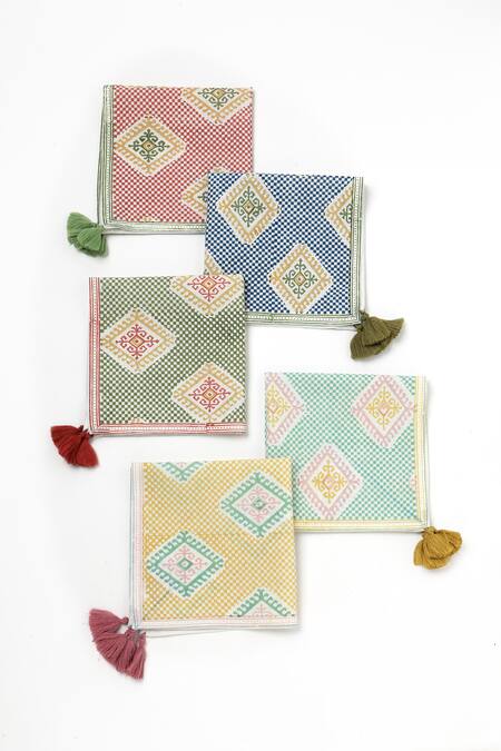 Aqua square shaped 4 pcs napkins with cream geometric hand block printed & tassel detailing on 4 corners.