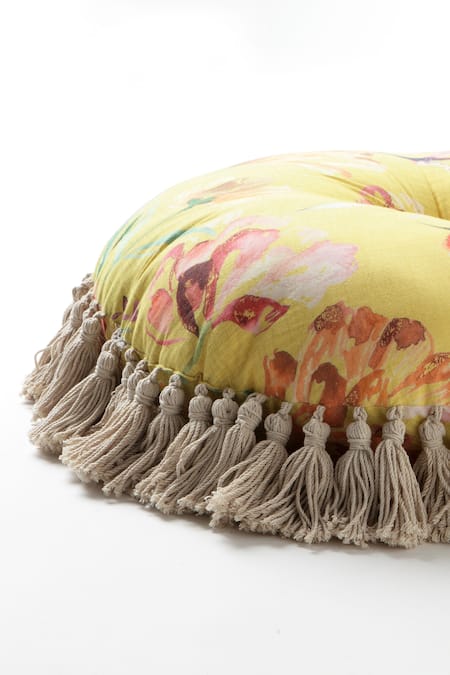 Yellow and white pouf pillow with floral print and signature accent tassels
