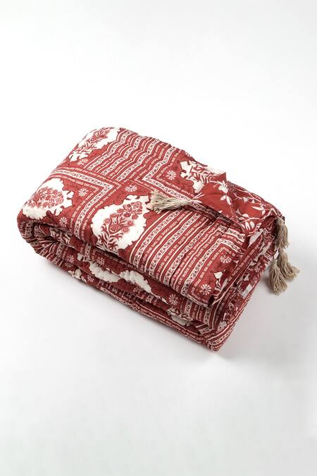 Red and white handcrafted silk cotton reversible jaipur quilt with 100% cotton filling, accentuated with hand stitched tassels on 4 corners