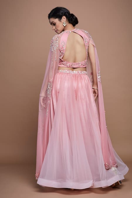 Pastel pink net lehenga featuring sequins and beaded hand embroidered waistband. Paired with a padded blouse with cape sleeves and a round neckline.