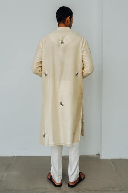 Beige kurta featuring long sleeves, mandarin collar, and floral bumblebee aari embroidery. Paired with a plain straight pant.