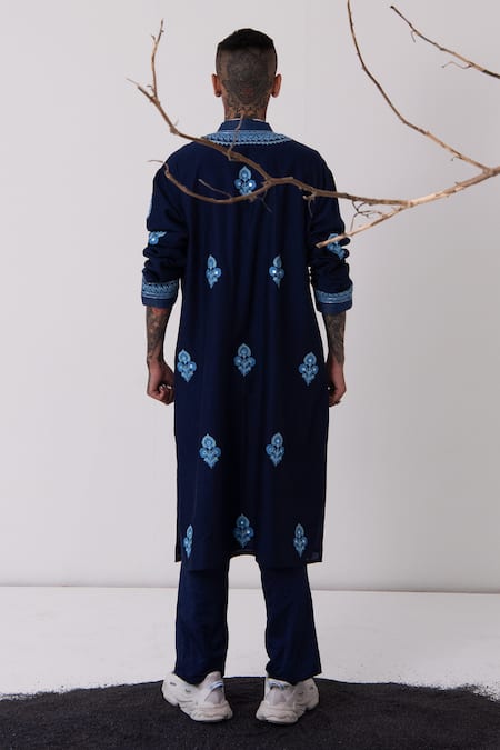 Indigo chanderi kurta with floral, aari, sequin, cutdana, bead embroidery all over & mandarin collared neckline. Paired with pant.