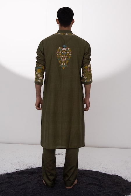 Olive chanderi kurta with garden, aari embroidery & mandarin collared neckline. Paired with pant.
