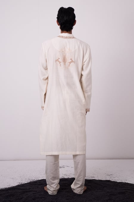 Ivory chanderi kurta with dancing deer, mirror, aari, sequin, cutdana, bead embroidery. Paired with pant.