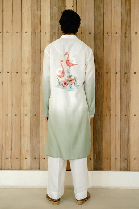 Ivory kurta featuring flamingo amigo hand painted motifs and a mandarin collar. Paired with matching pants for a complete look.