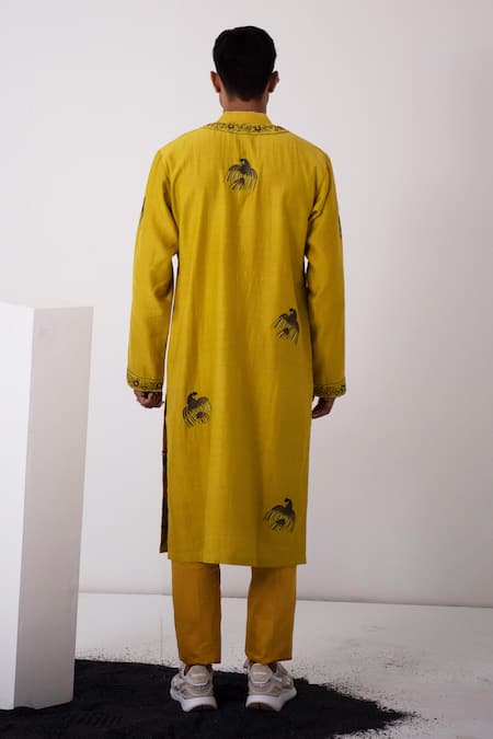 Mustard kurta with flock parrot, aari, sequin, bead, cutdana embroidery. Paired with pant.