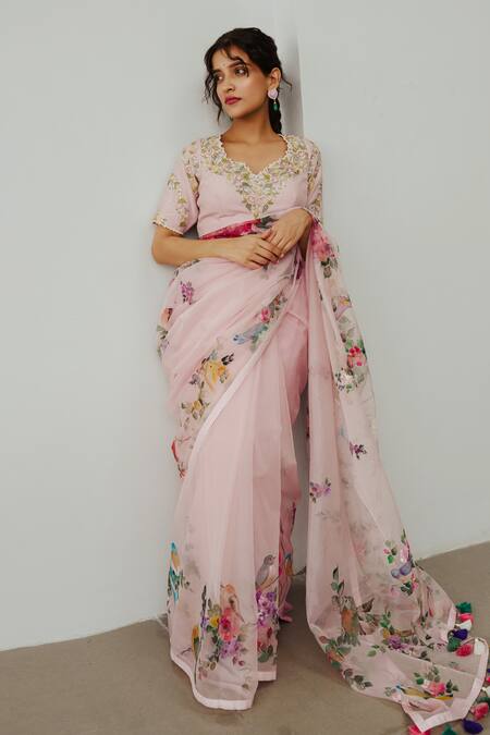 Pastel pink organza saree featuring floral hand painting. Paired with a floral and resham embroidered blouse with a leaf neck and half sleeves.