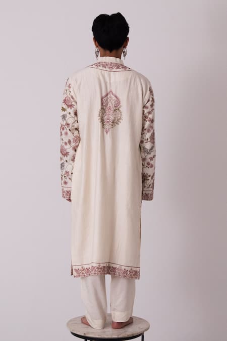 Ivory chanderi kurta with flying crane, aari, sequin, bead, cutdana embroidery & mandarin collared neckline. Paired with pant.