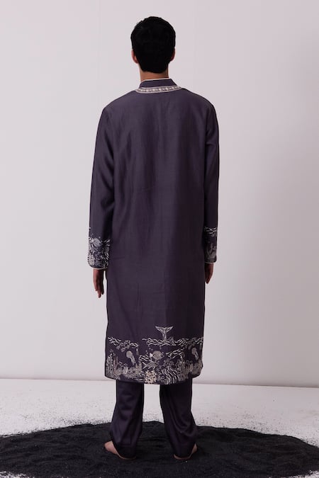 Charcoal chanderi kurta with merry mermaid, aari ,sequin, bead, cutdana embroidery on hem. Paired with pant.