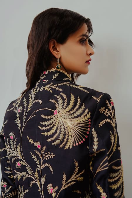 Black Chanderi Embroidery Collared The Great Indian Jacobean Jacket And Pant Set
