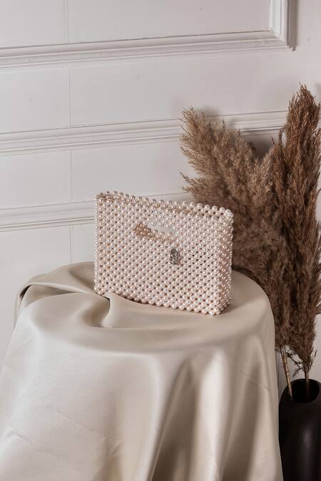 Pink, rose gold structured handbag with handwoven plastic beads.