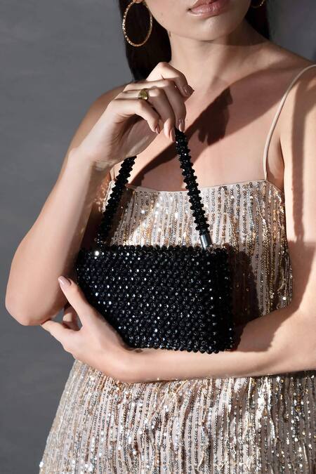 Black bag in glass crystal bead embellishments. Comes with beaded handle.
