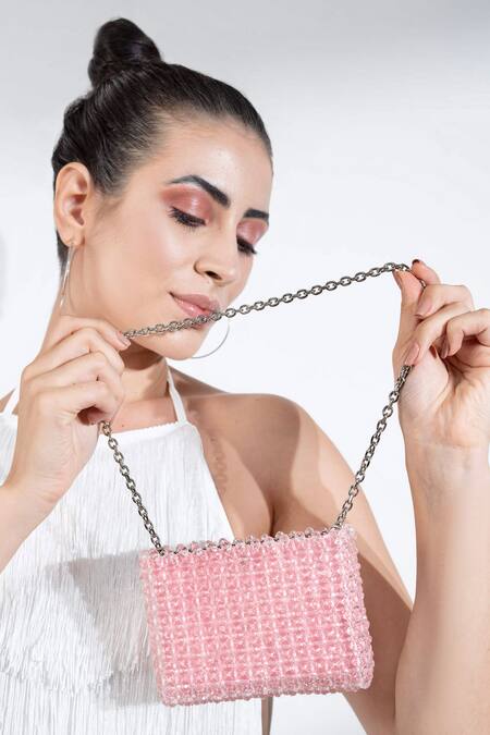 Pink mini bag in glass crystal bead embellishments. Comes with metal chain link handle.