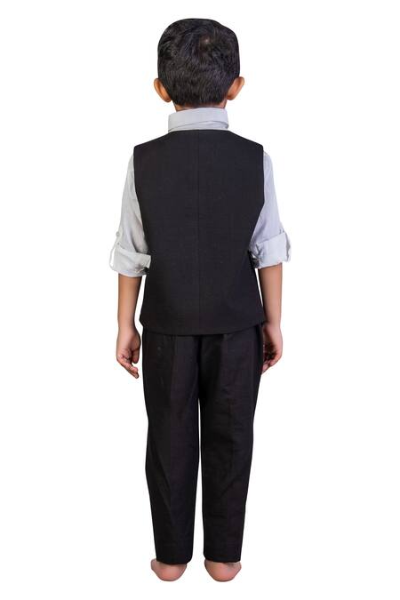A trendy and dapper look for your future style-star is this button-front black waist coat, teamed with matching slim pants. Comes with a cotton, button-front white shirt and black bow.