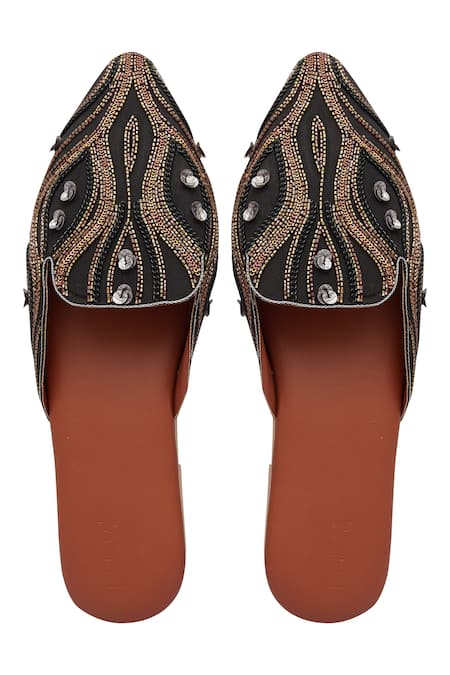 Black embellished mules featuring sequins, bugle beads, and a pointed toe