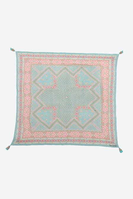 Light blue square scarf made from viscose chinon featuring a geometric print and tassels on the ends