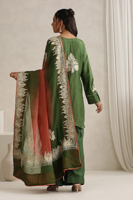 Green kurta featuring Kashmiri golden tilla embroidery. Paired with a farshi salwar and a matching dupatta.