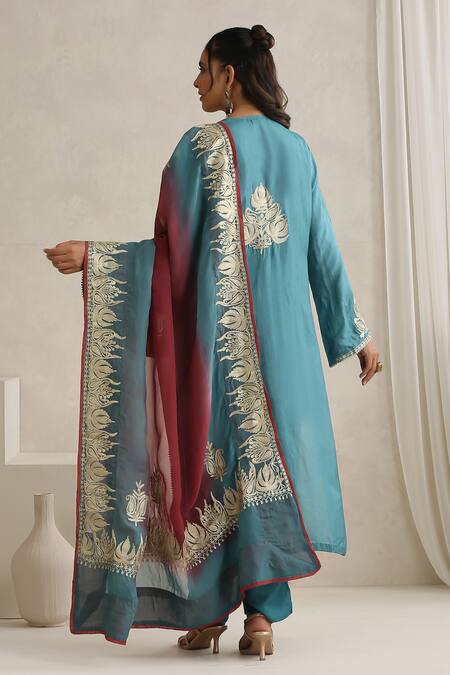 Blue kurta set featuring a straight silhouette with Kashmiri golden tilla embroidery. Includes a matching pant and dupatta made from organza, silk, and cotton.