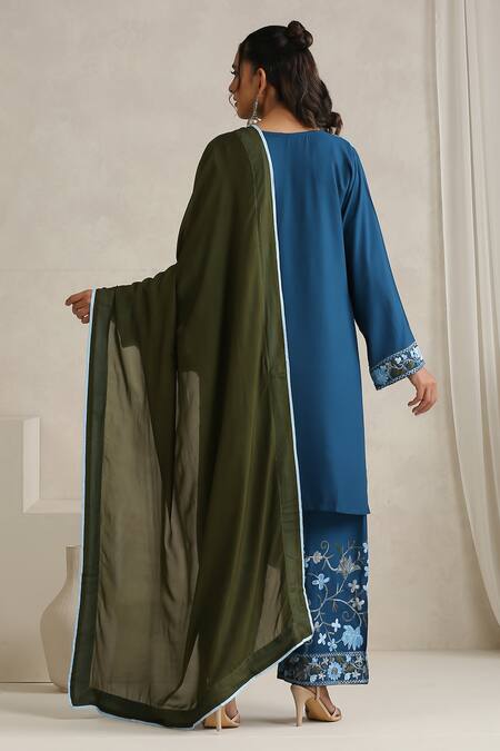 Navy blue kurta featuring Kashmiri aari embroidery with a round neckline and long sleeves. Paired with matching pants and a contrasting green dupatta.