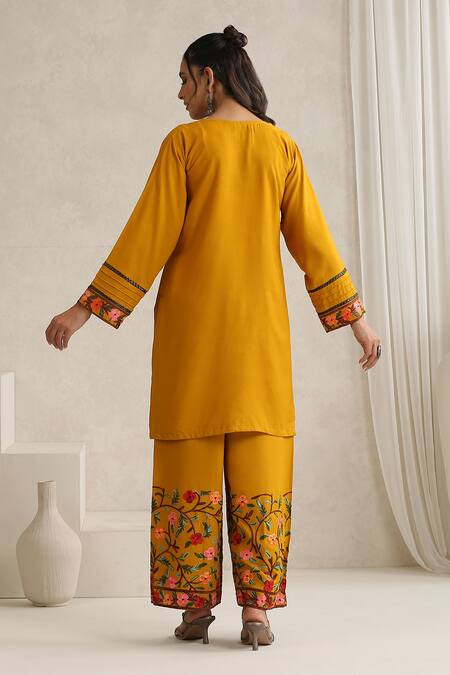 Mustard kurta featuring Kashmiri aari embroidery with a round neckline and long sleeves. Paired with matching mustard pants adorned with floral embroidery at the hem.