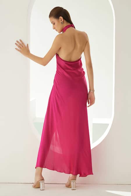 Hot pink halter neck dress featuring a solid base with a draped silhouette and side slit
